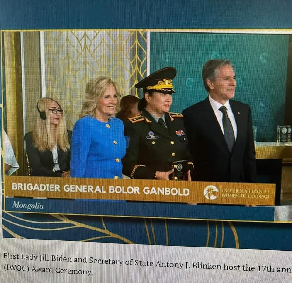 Монгол Улсын ЗХЖШ-ын Сургалт, бэлтгэлийн газрын дарга бригадын генерал Г.Болор АНУ-ын Цагаан ордонд жил бүр болдог Олон улсын эмэгтэйчүүдийн эр зоригийн (IWOC-Internatiol Women of Courage Award) шагнал гардан авлаа. Шагналыг АНУ-ын Төрийн нарийн бичгийн дарга Антони Ж.Блинкен болон Тэргүүн хатагтай Жилл Байден нар гардуулан өгөв. 2023 оны IWOC шагналыг дэлхийн өнцөг булан бүрээс шалгарсан нийгмийн гэрэлт ирээдүйг цогцлоохын төлөө ажиллаж буй “онцгой” гэсэн тодотголтой 11 эмэгтэйд олгосон байна.