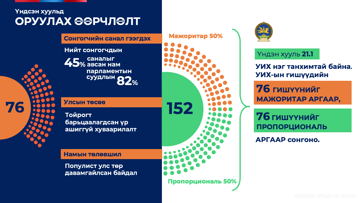Анх буюу 1992 онд ч парламент 122, 102 140 50 гишүүнтэй байх гээд олон хувилбар яригдаж байсныг Улсын Их Хурлын дарга дурдсан. Тухайн үед хүн амын тоо 2.2 сая, үүнээс 1.1 сая нь сонгуулийн насны иргэд байсан бол өнөөдөр 3.4 сая иргэний 2.2 сая нь сонгуулийн насныхан байна. 2 дахин өссөн, ийм үндэслэлээр төлөөллийн зарчмыг хангах шаардлагаар парламентын бүрэлдэхүүнийг 2 дахин өргөжүүлэх шаардлага үүсээд байна гэж үзсэн юм. Парламентын одоогийн бүтэц нь авлигал, нөлөөллийн эрсдэл өндөртэй. Тогтолцоо, тоог өөрчлөх өөр нэг шалтгаан бол санал гээгддэг асуудал юм. Ний нуугүй хэлэхэд 2020 оны Улсын Их Хурлын сонгуулиар МАН сонгуульд оролцсон иргэдийн 45.8 хувийн саналаар парламентын 80 хувийн суудлыг авсан. Үүний цаана сонгуульд оролцсон нийт иргэдийн 55 хувийнх нь санал мажоритар тогтолцооны онцлогоос болж гээгдсэн. Мэдээж ард иргэдтэйгээ нэн ойрхон, холбоотой ажилладаг гэх зэрэг давуу тал бий. Мажоритар тогтолцооны сайн тал ч бий, сул тал ч бий. Авлигал, хээл хахуулиас ангид, үр нөлөөтэй шийдвэр гаргадаг гэж ард нийтдээ хүлээн зөвшөөрөгдсөн парламентуудын жишиг харахад дандаа 100-аас дээш гишүүнтэй байгаа гэдгийг хэлж, тоо баримтууд танилцуулав.
