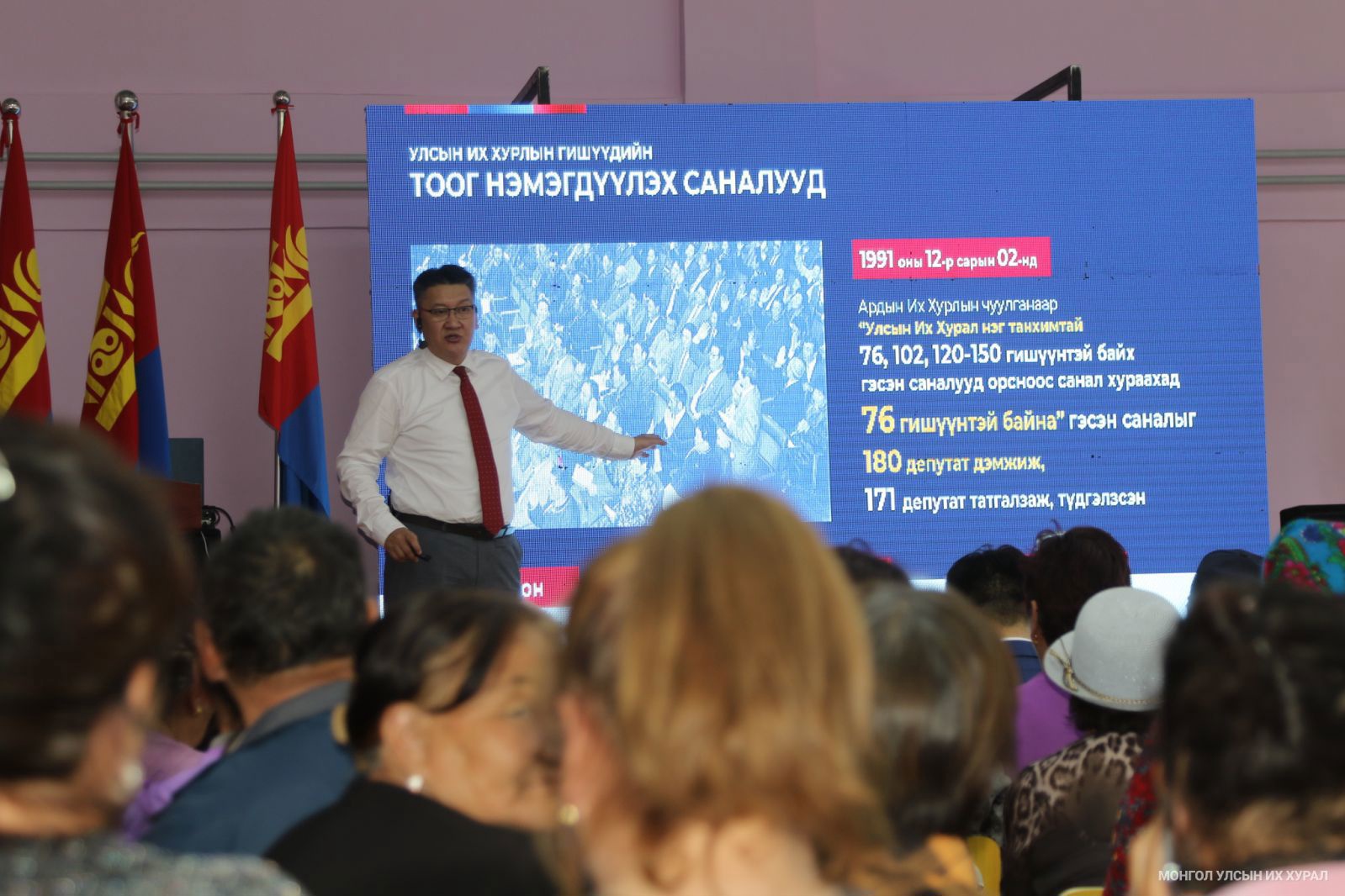 Иргэдийг төлөөлөх парламентын чадамжийг сайжруулах зорилгоор Улсын Их Хурлын гишүүдийн тоог 152 болгон хүн амын тоотой уялдуулан нэмэгдүүлэхээр, нийт гишүүний тавин хувийг мажоритар, тавин хувийг пропорционал аргаар сонгох зохицуулалтыг төсөлд тусгасан талаар танилцуулж, холбогдох судалгаа, мэдээллийг дэлгэрэнгүй тайлбарласан юм. Түүнчлэн төсөлтэй холбогдуулан иргэдийн байр суурийг сонсож, саналыг авсан юм.