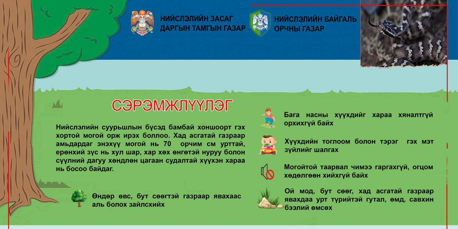 Иймд иргэд суурьшлын бүсэд могой харсан тохиолдолд Нийслэлийн Байгаль орчны газрын 11-323780, ажлын бус цагаар Нийслэлийн Шуурхай удирдлага зохицуулалтын төвийн 11-310005 дугаарын утсаар яаралтай мэдээлэл өгч, мэргэжлийн хүмүүс иртэл могойн байршлыг сайтар харж байх, хэрэв хатгуулсан тохиолдолд яаралтай эмнэлгийн байгууллагад хандана уу.
