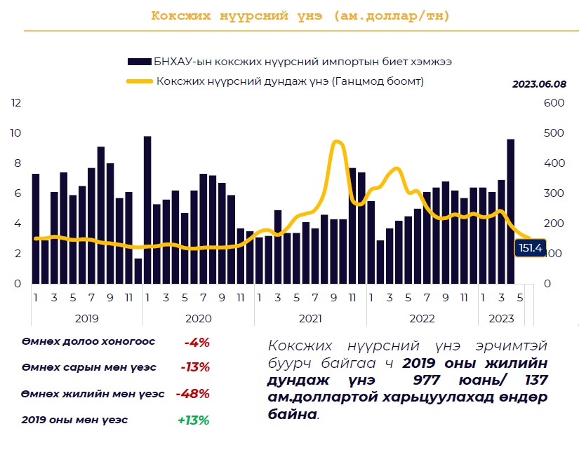 Улсын хэмжээнд 2023 оны эхний 5 сарын байдлаар 23.1 сая.тн нүүрс экспортолсны 42.9 хувийг “Эрдэнэс Тавантолгой” ХК-ийн экспорт эзэлж байна. Оны эхний 5 сарын байдлаар улс болон орон нутгийн төсөвт 1.0 их наяд төгрөгийн татвар, төлбөр, хураамж төлсөн. Үүнээс АМНАТ (Ашигт малтмалын нөөц ашигласны төлбөр) -д 727.7 тэрбум төгрөг, аж ахуйн нэгжийн орлогын албан татварт 288.9 тэрбум төгрөг, бусад төрлийн татварт 44.6 тэрбум төгрөг төвлөрүүлжээ.