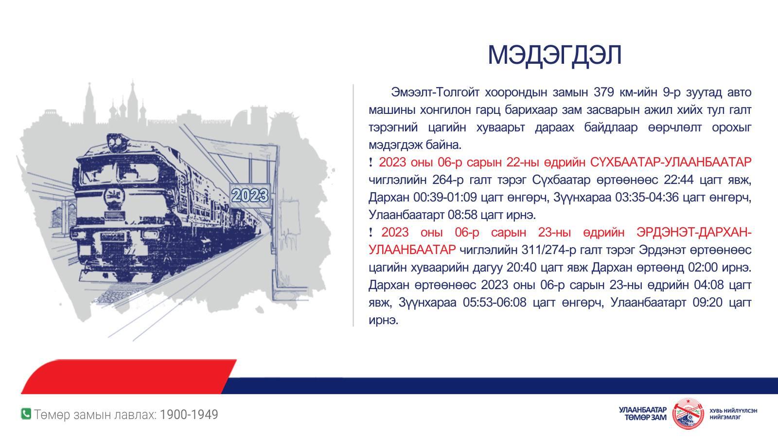 Эмээлт-Толгойт хоорондын замын 379 км-ийн 9-р зуутад авто машины хонгилон гарц барихаар зам засварын ажил хийх тул галт тэрэгний цагийн хуваарьт дараах байдлаар өөрчлөлт орохыг мэдэгдэж байна.