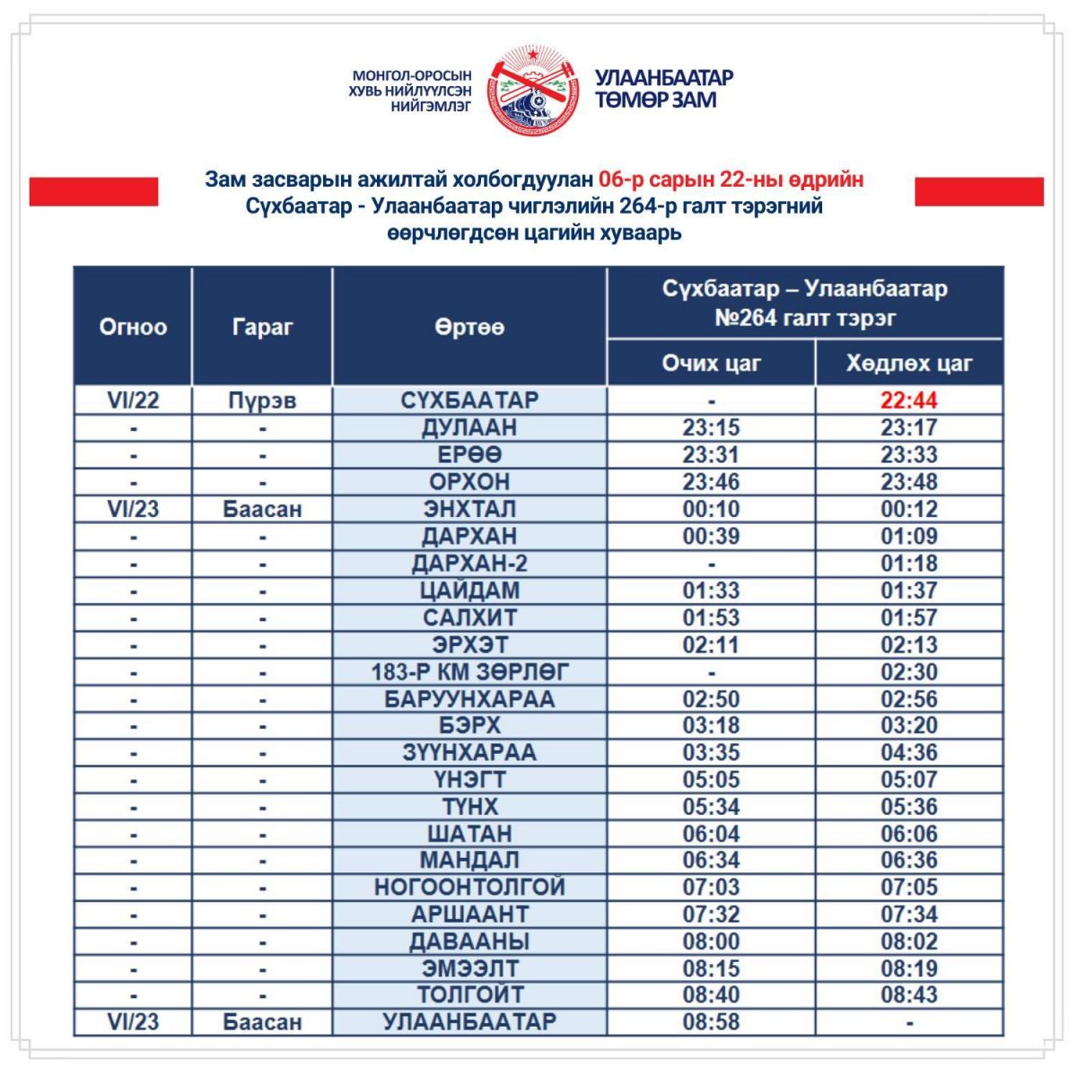 - 2023 оны 06-р сарын 22-ны өдрийн Сүхбаатар-Улаанбаатар чиглэлийн 264-р галт тэрэг Сүхбаатар өртөөнөөс 22:44 цагт явж, Дархан 00:39-01:09 цагт өнгөрч, Зүүнхараа 03:35-04:36 цагт өнгөрч, Улаанбаатарт 08:58 цагт ирнэ.