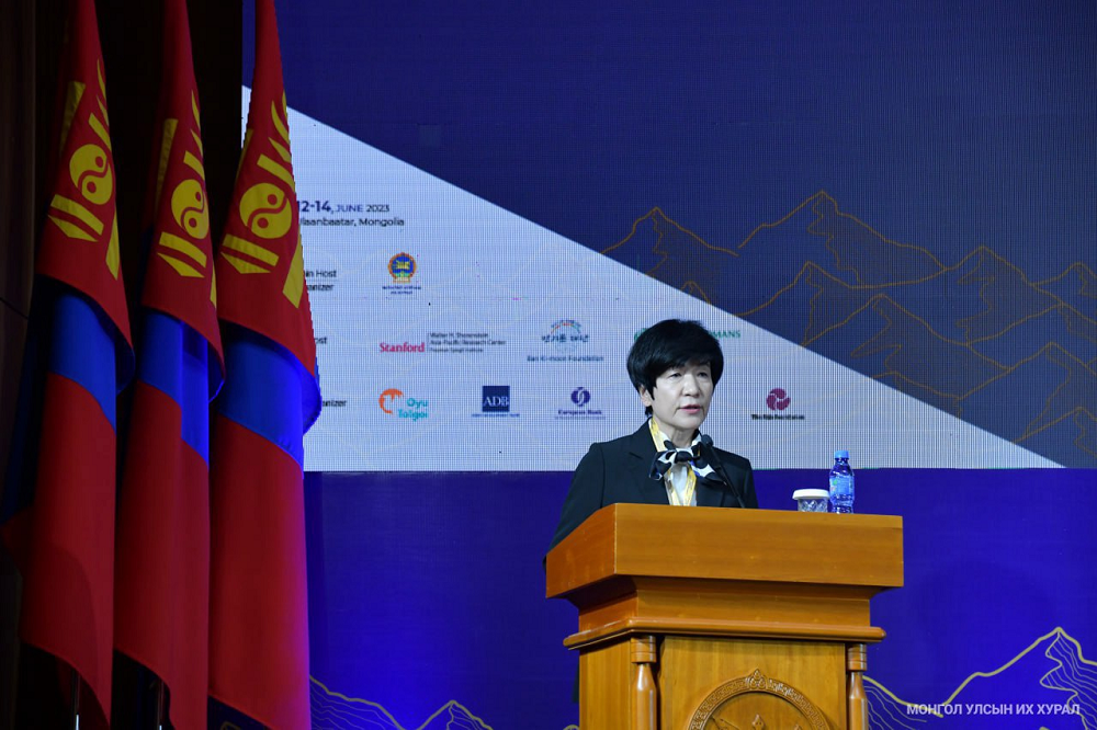 Тэрбээр, Тогтвортой хөгжлийн зорилтуудын "Хэнийг ч орхихгүй" гэсэн уриа бидний сэтгэлийг хөдөлгөж байна. Энэ бол эмэгтэйчүүдийг чадавхижуулахгүйгээр биелэх боломжгүй зорилго юм. Гэвч Азийн хэд хэдэн орнуудад эмэгтэйчүүд улс төр, эдийн засаг зэрэг нийгмийн олон салбарт ялгаварлан гадуурхалттай тулгарсаар байна. Монгол Улс багтдаг алтай дамнасан бүс нутагт тогтвортой хөгжлийг дэмжих арга замыг судлахаар бид хуран чуулаад байна гээд БНСУ-д жендэрийн тэгш байдлыг хангах талаар хэрхэн тэмцэж амжилтад хүрсэн түүхээ хуваалцлаа.