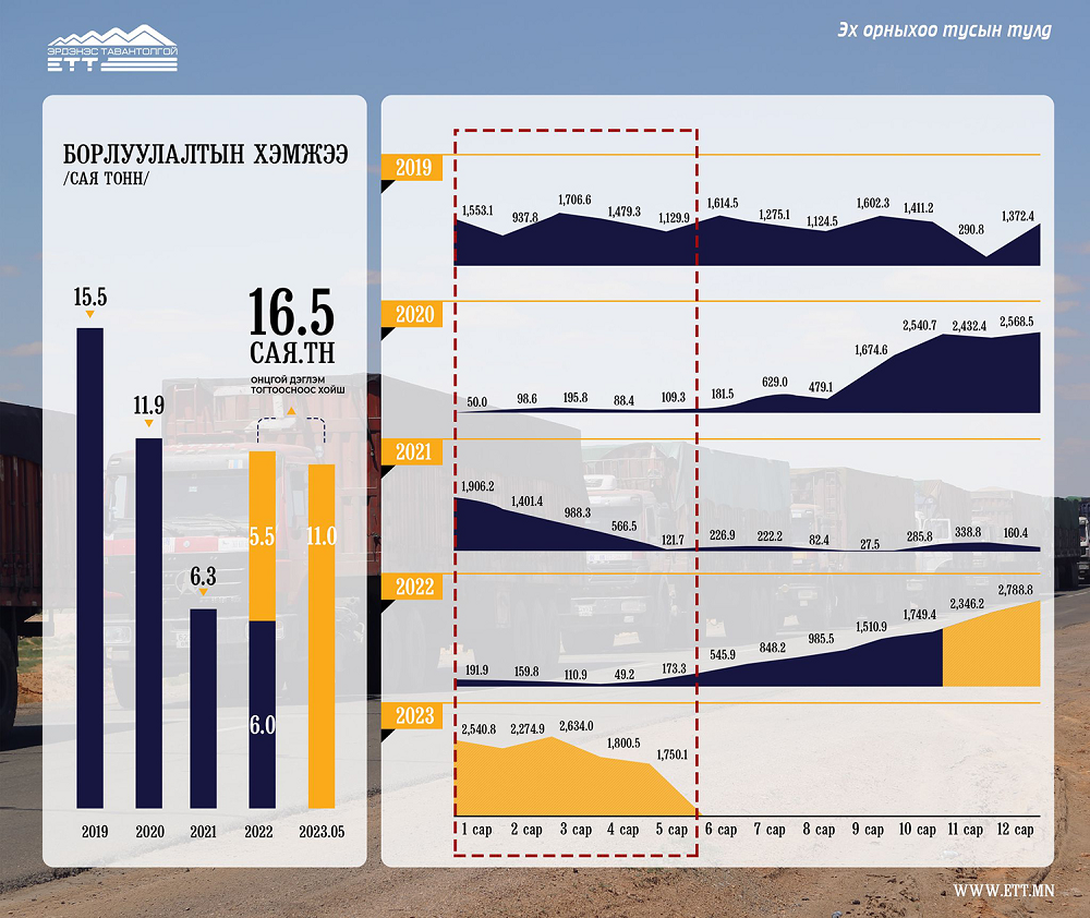 Өнгөрсөн онд бүтэн жилийн гүйцэтгэлээр 11.4 сая.тн нүүрс борлуулж байсан бол энэ оны 6 сарын 13-ны байдлаар 11.5 сая.тн нүүрс борлуулсан нь компанийн түүхэн дэх хамгийн өндөр гүйцэтгэл боллоо.