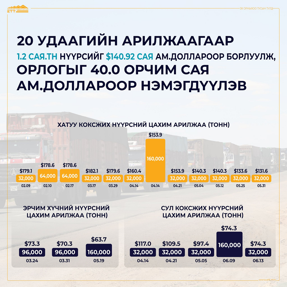 “Эрдэнэс Тавантолгой” ХК нүүрсийг биржээр, хил нөхцөлөөр арилжаалах ажлыг амжилттай зохион байгуулж байна. Монголын хөрөнгийн биржээр дамжуулан нүүрсний ил тод, нээлттэй цахим арилжааг энэ оны 2 дугаар сарын 9-нд анх удаа зохион байгуулж, түүнээс хойш нийт 20 удаагийн арилжаагаар 1,216 мян.тн нүүрсийг $140.9 сая ам.доллароор борлуулж, орлогыг 40 орчим сая ам.доллароор нэмэгдүүллээ.