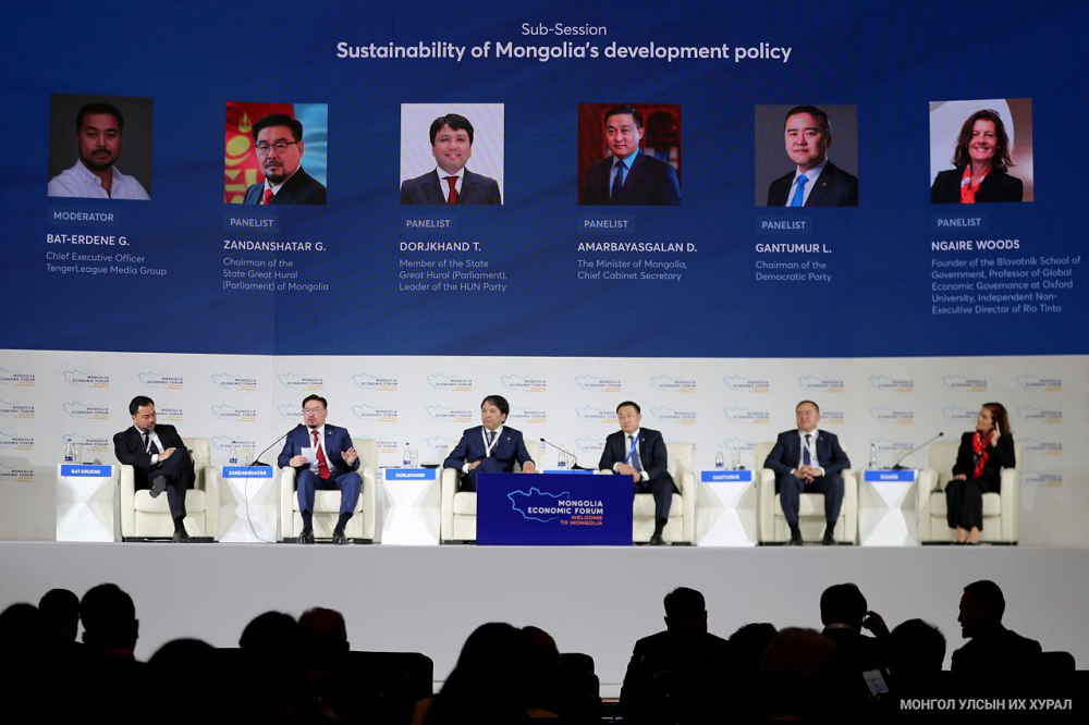 Үргэлжлүүлэн “Монгол Улсын хөгжлийн тогтвортой байдал” сэдвээр хэлэлцүүлэг өрнүүллээ. Уг хэлэлцүүлэгт Монгол Улсын Их Хурлын дарга Г.Занданшатар, Монгол Улсын сайд, ЗГХЭГ-ын дарга Д.Амарбаясгалан, Ардчилсан намын дарга Л.Гантөмөр, Улсын Их Хурлын гишүүн, ХҮН намын дарга Т.Доржханд, мөн Оксфордын их сургуулийн Засаглалын сургуулийн захирал, доктор Найрэ Вүүдс нар панелистаар оролцжээ. Хэлэлцүүлгээр панелистууд Үндсэн хуулийн нэмэлт өөрчлөлтөөр эдийн засгийн ямар боломжууд нээгдэж байгаа талаар санал солилцсон юм.