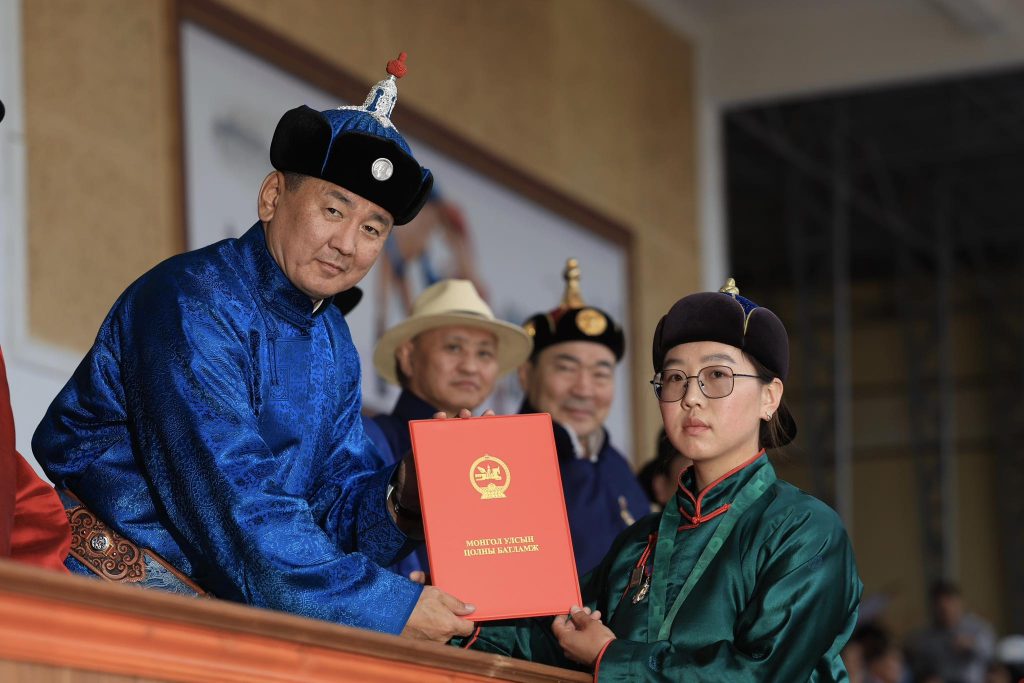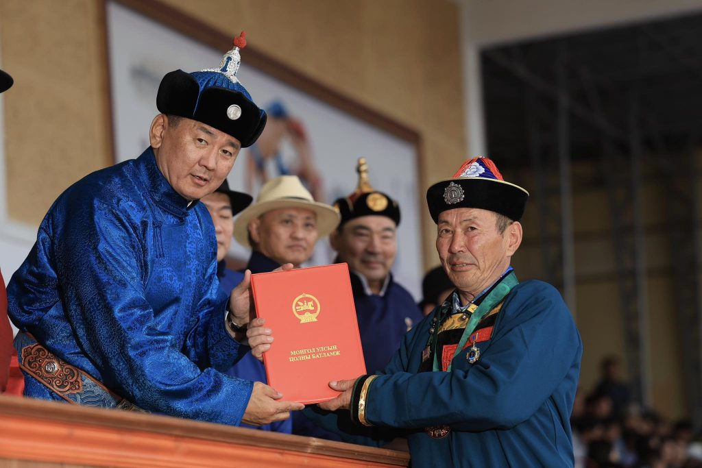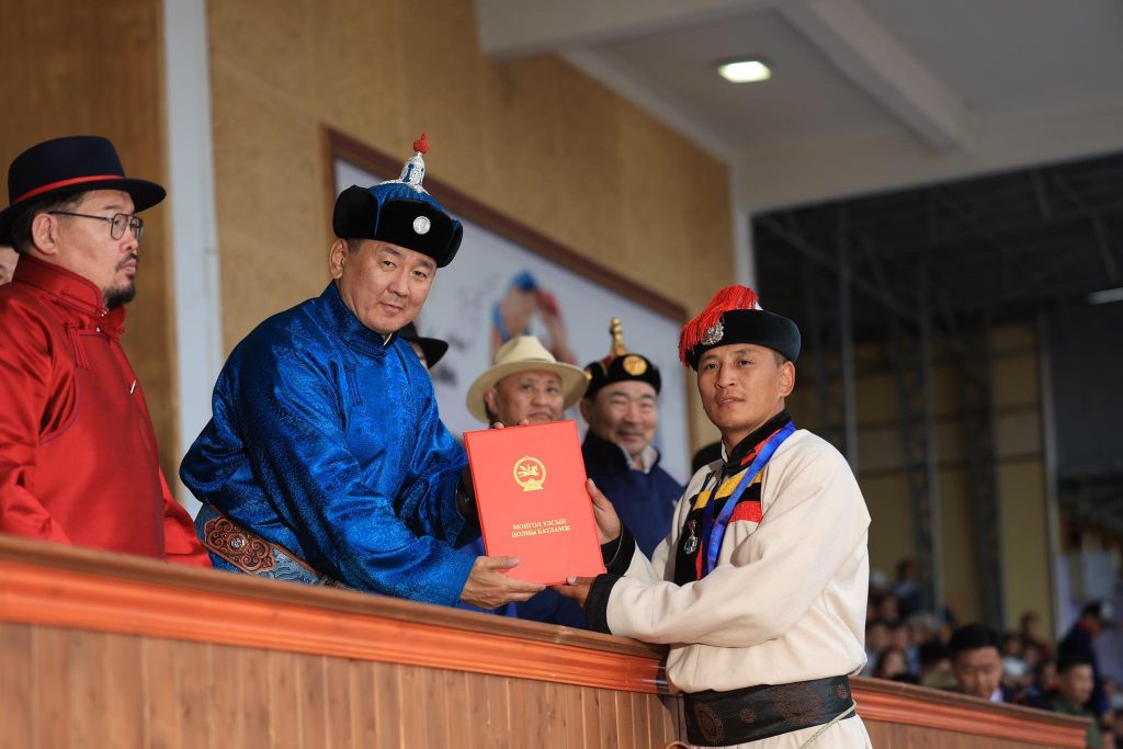 “Улсын цол олгох тухай” зарлигийг Монгол Улсын Ерөнхийлөгчийн Тамгын газрын дарга Я.Содбаатар уншиж танилцуулсны дараа Монгол Улсын Ерөнхийлөгч Ухнаагийн Хүрэлсүх харваачдад Монгол Улсын цолны батламж, тэмдгийг нь гардуулан өгч, баяр хүргэлээ.