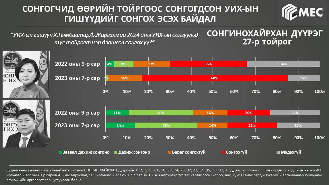 Тун удахгүй энэ удаагийн парламентийн хамгийн "отгон" намрын чуулган нээлтээ хийнэ. УИХ-ын гишүүд сонгогчдоор дүнгээ тавиулж, дахин сонгогдох эсэх нь ирэх жил тодорхой болно. Гэхдээ судалгааны байгууллагуудаар дамжуулж, эхнээсээ урьдчилсан дүн гарчээ. Тодруулбал, Сонгинохайрхан дүүрэг буюу УИХ-ын 27 дугаар тойрогт нэр дэвшиж, суудал авсан УИХ-ын гишүүн Б.Жаргалмаа, Х.Нямбаатар нарт тун "ЭВГҮЙ" дүн тавьжээ. Тухайлбал,