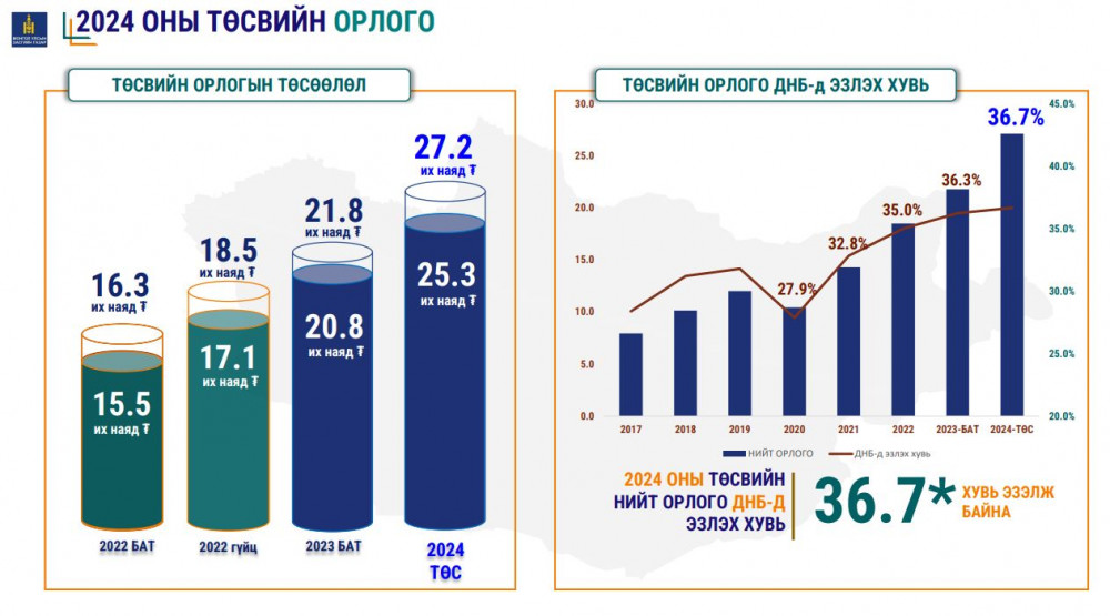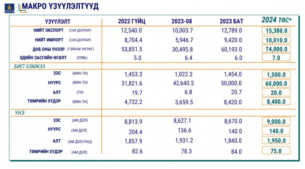 Ирэх 2024 онд манай улсын ДНБ-ийг 74 их наядад хүргэхээр төлөвлөжээ. 2023 оны 8 сарын байдлаар ДНБ 30.5 их наядын гүйцэтгэлтэй байгаа бөгөөд оны эцэст 60 их наяд хүрэх аж.