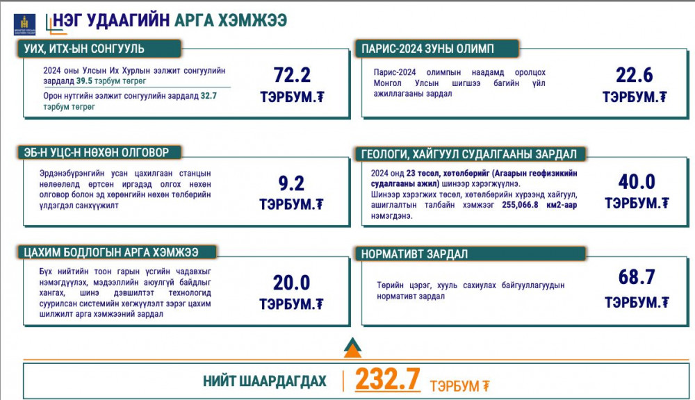 Зарцуулалтын тухайд, УИХ, ИТХ-ын сонгуульд 72,2 тэрбум, Парис-2024 олимпийн наадамд 22,6 тэрбум, Эрдэнэбүрэнгийн УЦС-ын нөхөн төлбөрт 9,2 тэрбум, геологи, хайгуулын ажилд 40 тэрбум, цахим бодлогын арга хэмжээнд 20 тэрбум, нормативт зардалд 68,7 тэрбум төгрөг зарцуулахаар тусгагджээ.