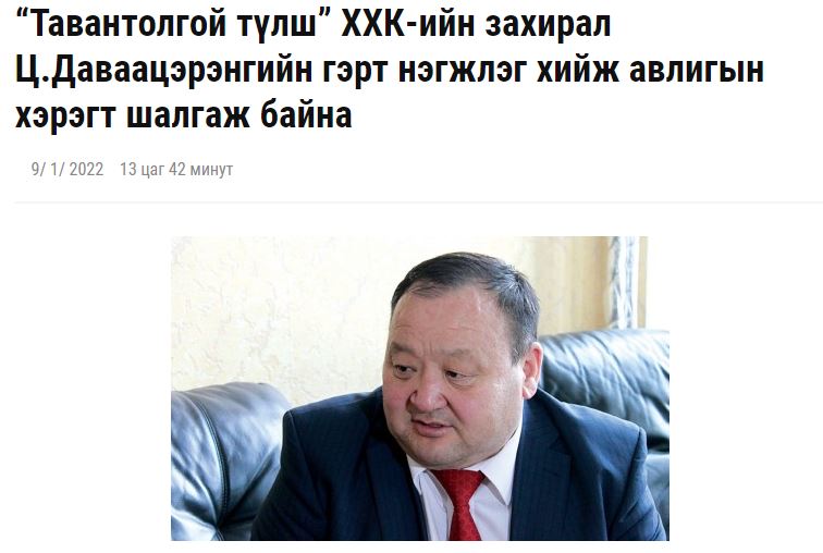 Өнгөрсөн жил “Тавантолгой түлш” ХХК-ийн гүйцэтгэх захирал Ц.Даваацэрэн тус компанийн ерөнхий нягтлан бодогч н.Билэгдэмбэрэл нарыг хууль хяналтын байгууллагаас шалгаж, АТГ-ын мөрдөгчид Ц.Даваацэрэнгийн гэр болон албан өрөөнд нэгжлэг хийж, санхүүгийн бичиг баримтыг лацдаж, бэлэн мөнгийг эд мөрийн баримтаар хураан авсан байдаг.