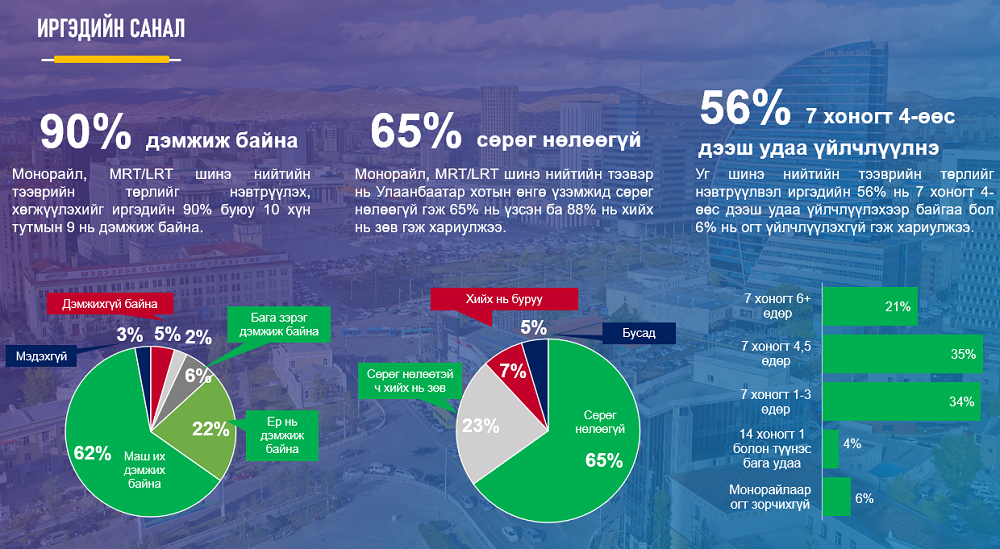 Мөн иргэдээс түгжрэлийг бууруулах чиглэлээр ямар ажил хийвэл үр дүнтэй талаар асуухад хамгийн их дэмжлэг авсан нь гэрийн ойролцоо сургууль, цэцэрлэг шинээр барьж, хүрэлцээг нэмэгдүүлэх хэрэгтэй гэх санал байсан. Үүний дараа томоохон зах, худалдааны төвүүдийг дэд төвүүдэд тархаан байршуулах, метро болон их багтаамжийн нийтийн тээврийн хэрэгслийг нэвтрүүлэх, нийтийн тээврийн парк шинэчлэл, ухаалаг гэрлэн дохионы зохицуулалт гэж санал өгсний дагуу нийслэлийн удирдлагууд судалгаан дээр үндэслэн ажиллаж байна. Иргэдийн 90 хувь нь багтаамж ихтэй нийтийн тээврийн хэрэгсэл, тэр дундаа метрог дэмжиж байгаа судалгаа гарсан юм.