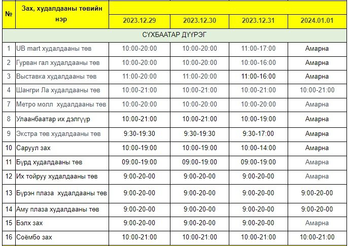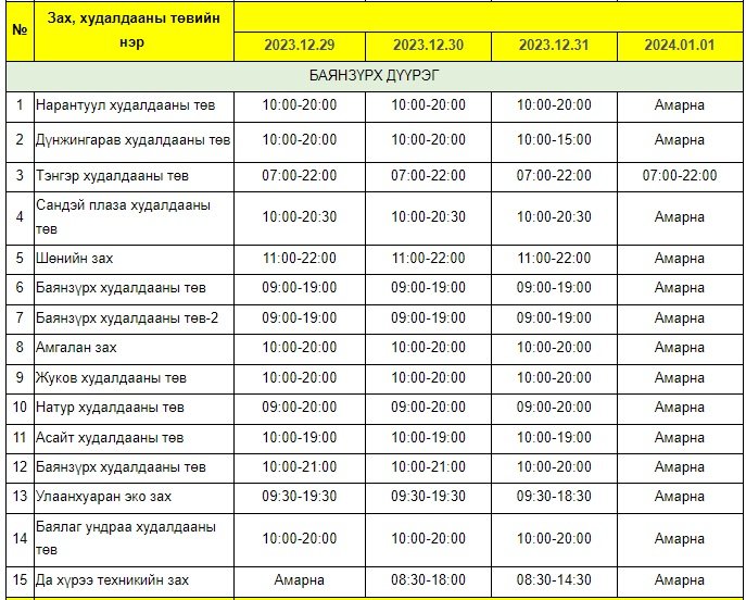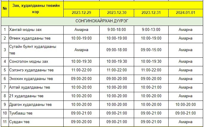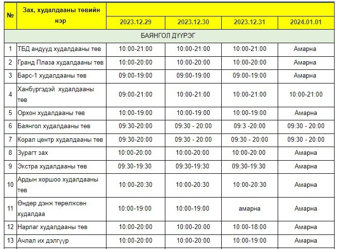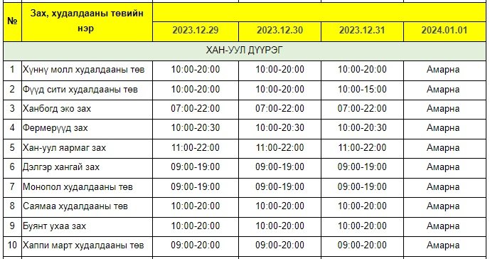 Энэ хугацаанд зах, худалдааны төв, хүнсний сүлжээ болон барааны дэлгүүрүүдийн ажиллах хуваарийг гаргажээ.