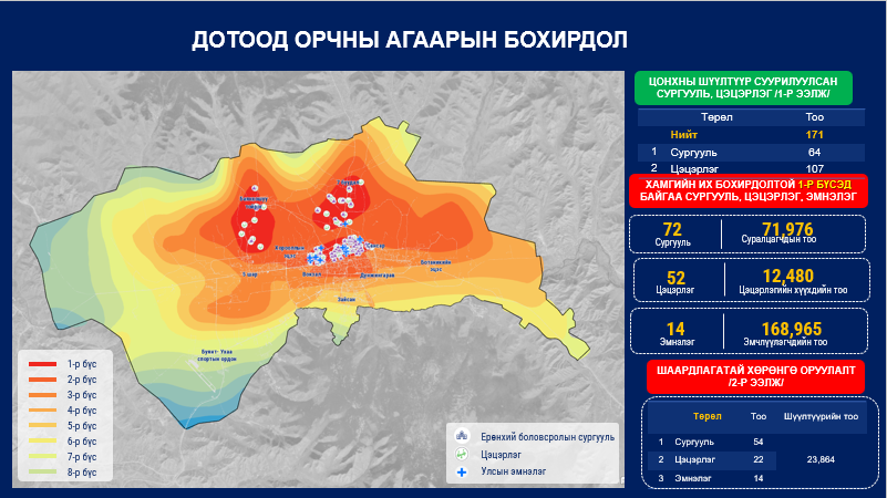 - Сургууль, цэцэрлэг, эмнэлгийн дотоод орчны бохирдлыг бууруулах