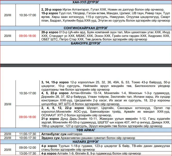 Цахилгаан шугам тоноглолд засвар үйлчилгээ хийх гуравдугаар сарын хуваарийг Улаанбаатар цахилгаан түгээх сүлжээ компаниас зарласан. Харин өнөөдөр буюу гуравдугаар сарын 20-ны өдөр дараах байршилд цахилгааны хязгаарлалт хийх хуваарьтай байна.