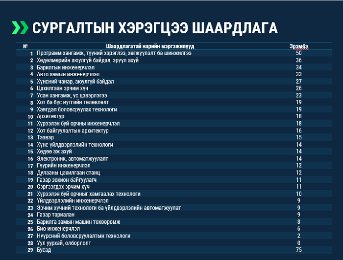 Цаашид нийслэлийн нутгийн захиргааны байгууллагын албан хаагчдыг чадавхжуулж, хүний нөөцийг бэхжүүлэхийн тулд гадаад сургалтад хамруулах бодлогыг баримталж буй. Үүнтэй холбоотойгоор нийслэлийн нутгийн захиргааны харьяа 40 байгууллагад нэн шаардлагатай байгаа төрөлжсөн болон нарийвчилсан мэргэжлийг тодорхойлох судалгааг хийхэд дараах мэргэжлүүд хамгийн их санал авсан бөгөөд эхний ээлжид инженер техникийн ажилтнуудыг гадаад сургалтад хамруулж, мэргэшүүлнэ гэдгийг Хотын дарга хэллээ.