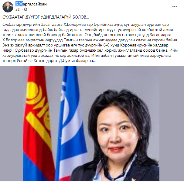 Б.Жаргалсайхан Өөрийн хуудаснаа нийтлэх дээ: “Сүхбаатар дүүргийн Засаг дарга Х.Болормаа гэр бүлийнхээ хүнд хутгалуулан зургаан сар гадаадад эмчилгээнд байж байгаад ирсэн. Түүнийг ирэнгүүт тус дүүрэгтэй холбоотой ажил төрөл хөдлөх шинжтэй болоод байсан юм. Онц байдал тогтоосон энэ цаг үед Засаг дарга Х.Болормаа амралтын өдрүүдэд Тамгын газрын ажилтнуудаа дагуулан салхинд гарсан байна. Энэ эх захгүй архидалт хор уршгаа өгч тус дүүргийн 6-8 хүнд Коронавирусийн халдвар илэрч Сүхбаатар дүүргийн Тамгын газар бүхэлдээ хөл хорио, ажиглалтад ороод байна. Ийм хариуцлагатай үед архидах нь хэр зохистой вэ? Ийм албан тушаалтантай ямар хариуцлага тооцох ёстой вэ? Хотын дарга Д.Сумъяабазар аа..." гэж хатуухан хэлдгээрээ хэлээд авч. Үнэн үгийг хэлдгээрээ алдартай тэрээр хотын дарга Сумъяабазараас олон ч зүйл шаарддаг. Харин хариуг нь өгдгийг төдийлөн сайн мэдэхгүй ч хариуцлага алдсан дарга нарт хариуцлага тооцох цаг болсон гэж хэлэхэд буруутахгүй биз.