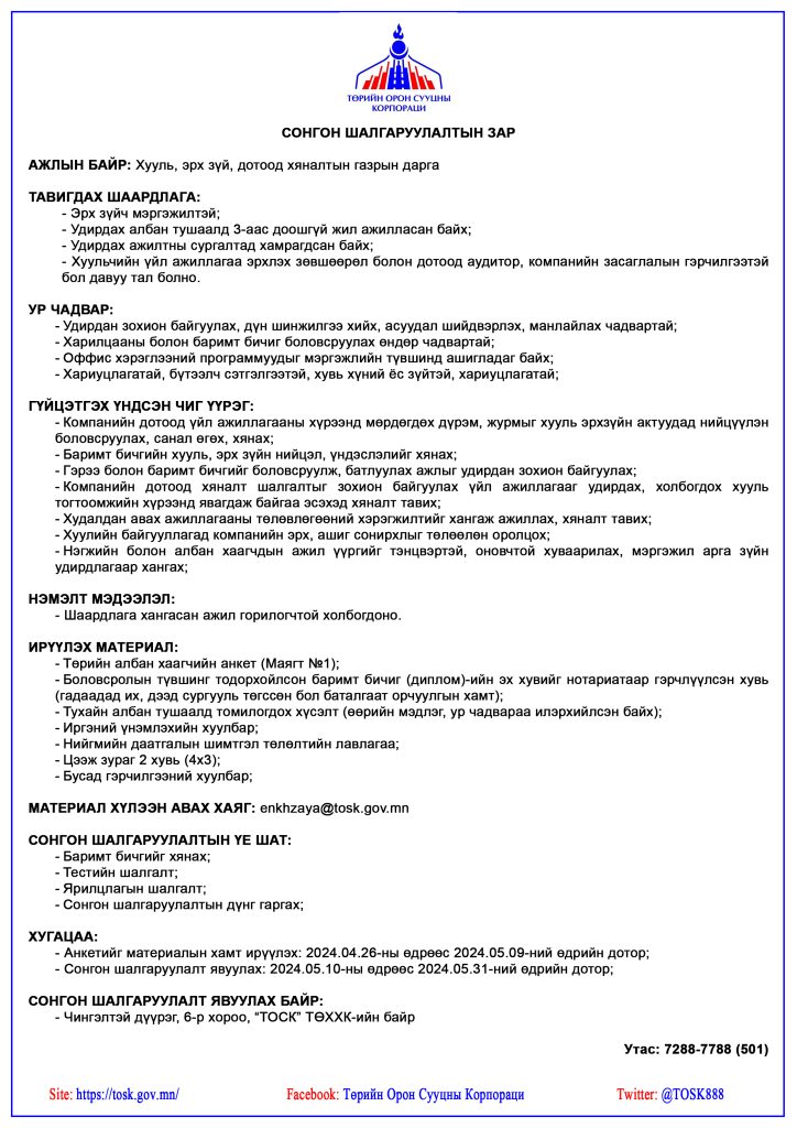 ТОСК-аас ажлын байрны сонгон шалгаруулалт зарлаж байна.