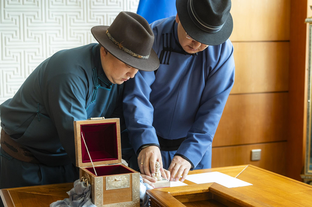 Монгол Улсын Ерөнхийлөгчийн Тамгын газрын дарга Я.Содбаатар, Улсын Их Хурлын Ерөнхий нарийн бичгийн дарга Д.Энхбат нар 2023 онд батлагдсан Монгол Улсын хуулиудад Төрийн тамга дарлаа.