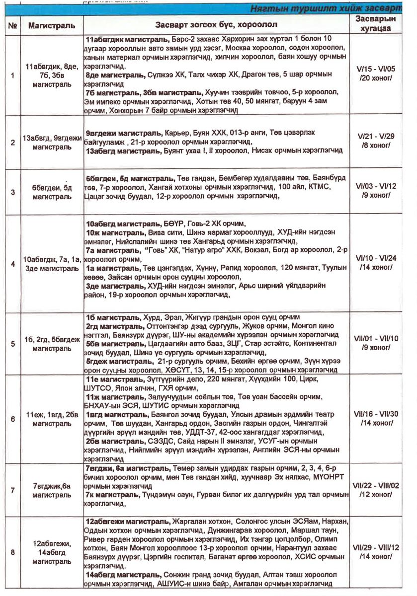 Тухайлбал тавдугаар сарын 15-наас зургаадугаар сарын 5-ныг хүртэл 20 хоногийн хугацаанд 1 болон 10 дугаар хороолол, Драгон, Таван шар, Москва хороолол, Содон хороолол, Хотын төв 40,50 мянгат, Баруун дөрвөн зам орчимд засвар хийгдэхээр байна.