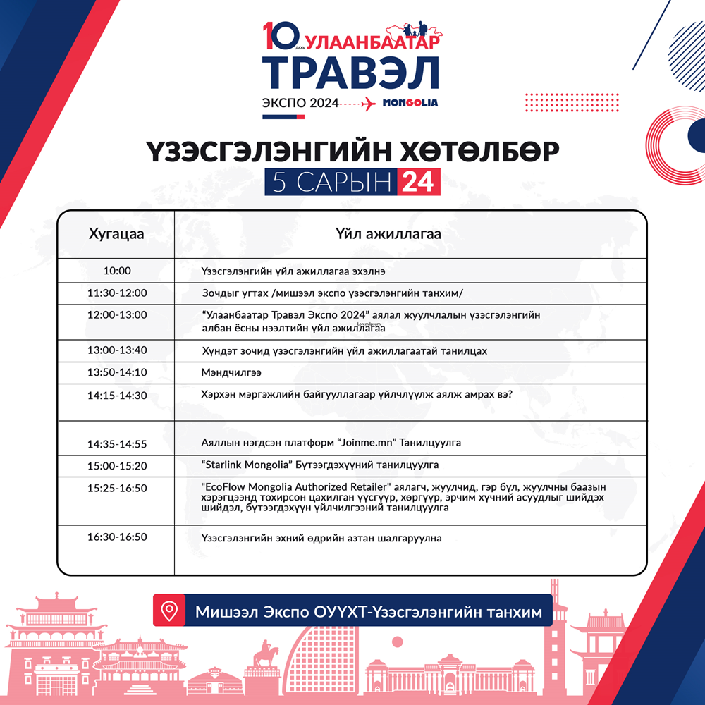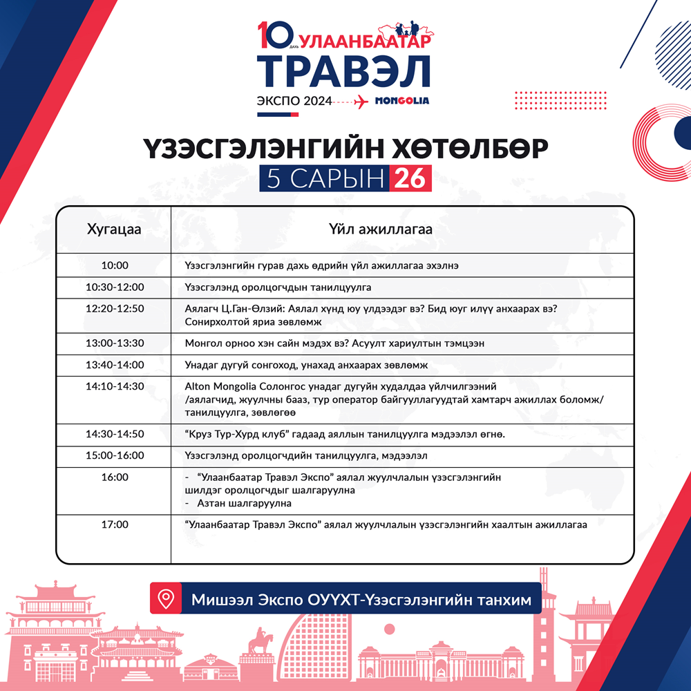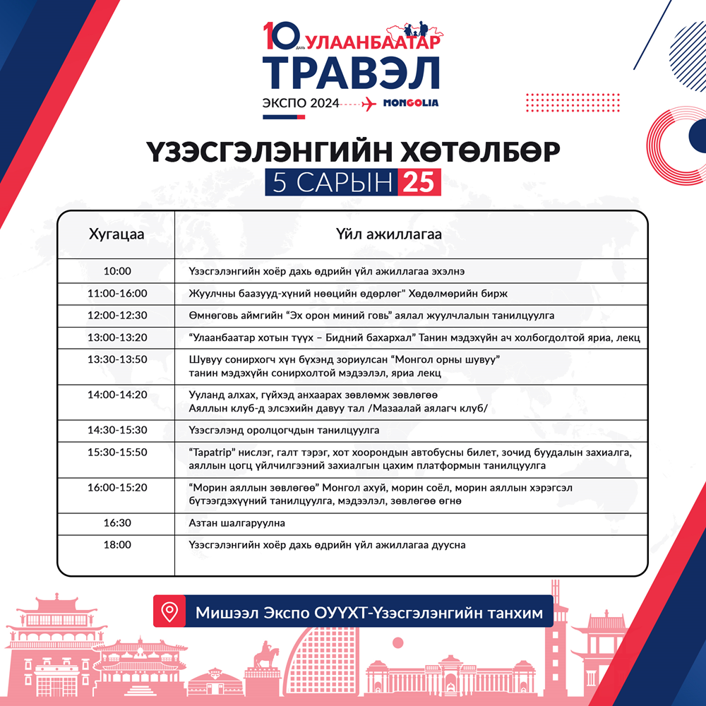 Нийслэлийн Аялал жуулчлалын газар, Улаанбаатар Аялал жуулчлалын холбоотой хамтран “Улаанбаатар травэл экспо-2024” аялал жуулчлалын үзэсгэлэнг тавдугаар сарын 24-26-ны өдрүүдэд “Мишээл экспо” төвд 10 дахь жилдээ зохион байгуулах гэж байна.