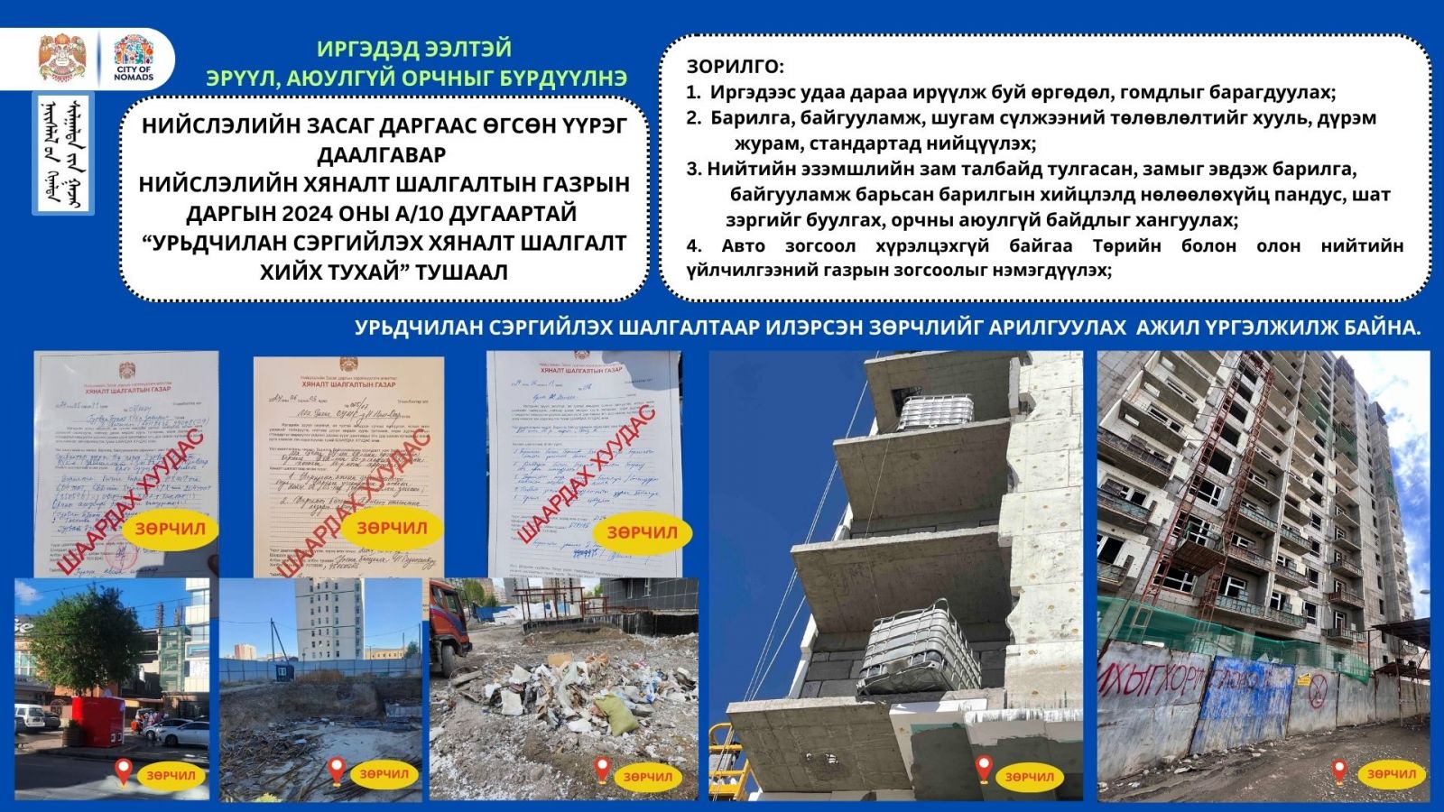 Энэхүү чиглэлийн хүрээнд нийслэл дэх барилга, дэд бүтцийн салбарын хяналтыг хэрэгжүүлэхээр Хяналт шалгалтын газрын 34, Хот байгуулалт, хотын стандартын газрын 6, Цагдаагийн удирдах газрын 6, дүүргүүдийн Хөдөлмөр халамжийн хэлтсийн 7 улсын ахлах байцаагч, мэргэжилтэн нарын оролцоотой нийт 53 хүний бүрэлдэхүүнтэйгээр тавдугаар сарын 24-ний өдрийг дуустал иргэдэд ээлтэй эрүүл, аюулгүй орчныг бүрдүүлэх ажлын хүрээнд дараах байршлуудад ажиллалаа.