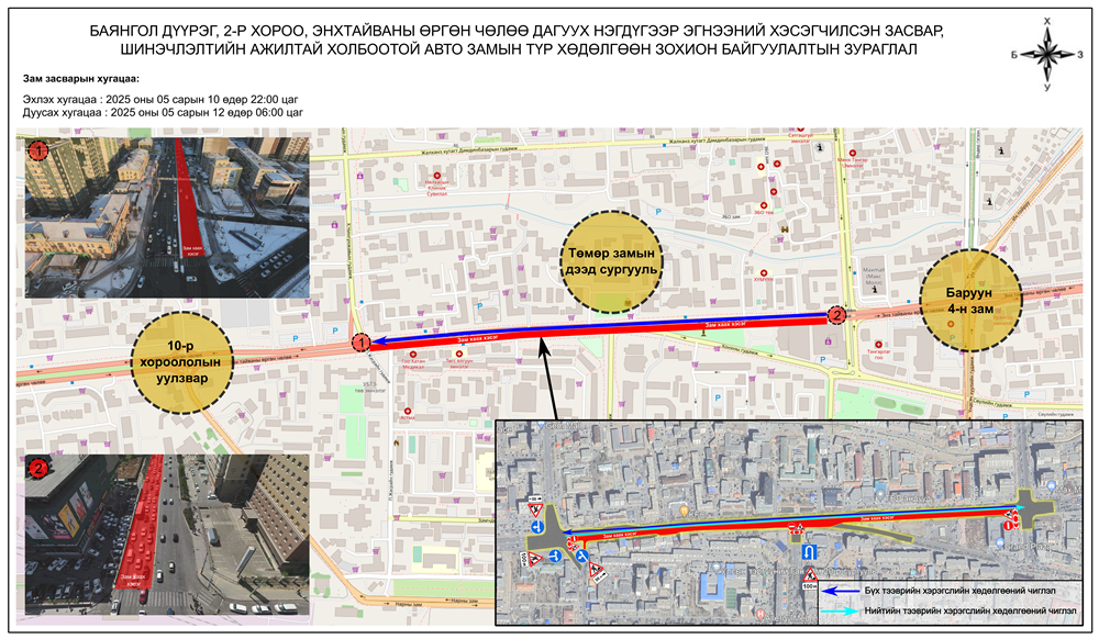 БГД-ийн 2 дугаар хороо, Энхтайваны өргөн чөлөөний авто зам шинэчлэлтийн ажлын хүрээнд 25 дугаар эмийн сангийн уулзвараас "Гранд плаза"-ийн уулзвар хүртэлх авто замын хойд хэсгийг 5 дугаар сарын 9-ний 22:00 цагаас 10-ны өдрийн 06:00 цагийн хооронд хааж, шинэчилнэ.