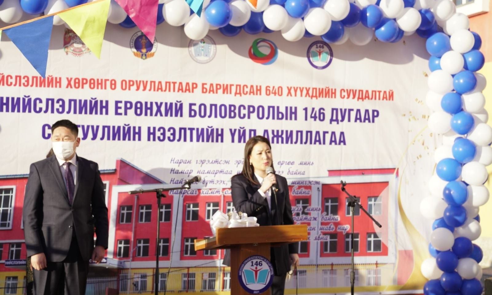 Тус сургуулийн нээлтэд Засаг дарга Ө.Сумъяабаатар болон бусад албаны төлөөллийн хамт оролцлоо. Энэ ташрамд БГД-ээс сонгогдсон УИХ-ын гишүүн, ЭЗБХ-ны дарга, дүүргийн МАН-ын дарга Ж.Ганбаатар танд онцгойлон талархал илэрхийлжээ. 146-р сургуулийн барилга байгууламжийг барьж бүтээх 4.2 тэрбум төгрөгийн санхүүжилтийг улсын төсөвт тусгуулж, газар чөлөөлөлтийн асуудлыг хувийн хөрөнгөөрөө шийдэж, хорооны 600 гаруй сурагчийг шинэ сургуультай болжээ.