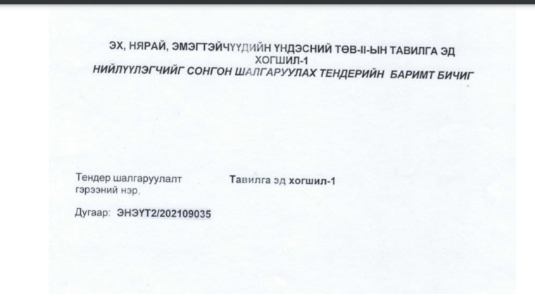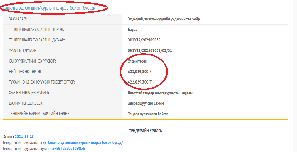 Тодруулбал, 2021 оны 11 сарын 15-ны өдөр “Эх, нярай, эмэгтэйчүүдийн төв II”-оос тавилга, эд хогшил тэр дундаа хурлын ширээ гэх мэт зүйлсийг 622.029.300 төгрөгөөр худалдан авах тендер зарлажээ. Уг тендерийн материалыг 2021 оны 12-р сарын 15-ны өдрийн 10:00 цагийн дотор ирүүлэхээр тооцоолжээ.