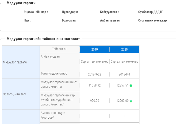 Үүний тод жишээ болсон дарга бол Сүхбаатар дүүргийн засаг дарга Х.Болормаа юм. Түүний хөрөнгө орлогын мэдүүлэг 2019, 2020 оны байдлаар бүртгэгдсэн байдаг. Уг хөрөнгө орлогод 2019 оныг 2020 онтой харьцуулахад түүний хөрөнгө орлого "нэмэгдсэн". Мөн хөрөнгийн талаар "худал мэдүүлэг" өгч байгаа нь олны дургуйцлыг хүргээд байгаа аж.