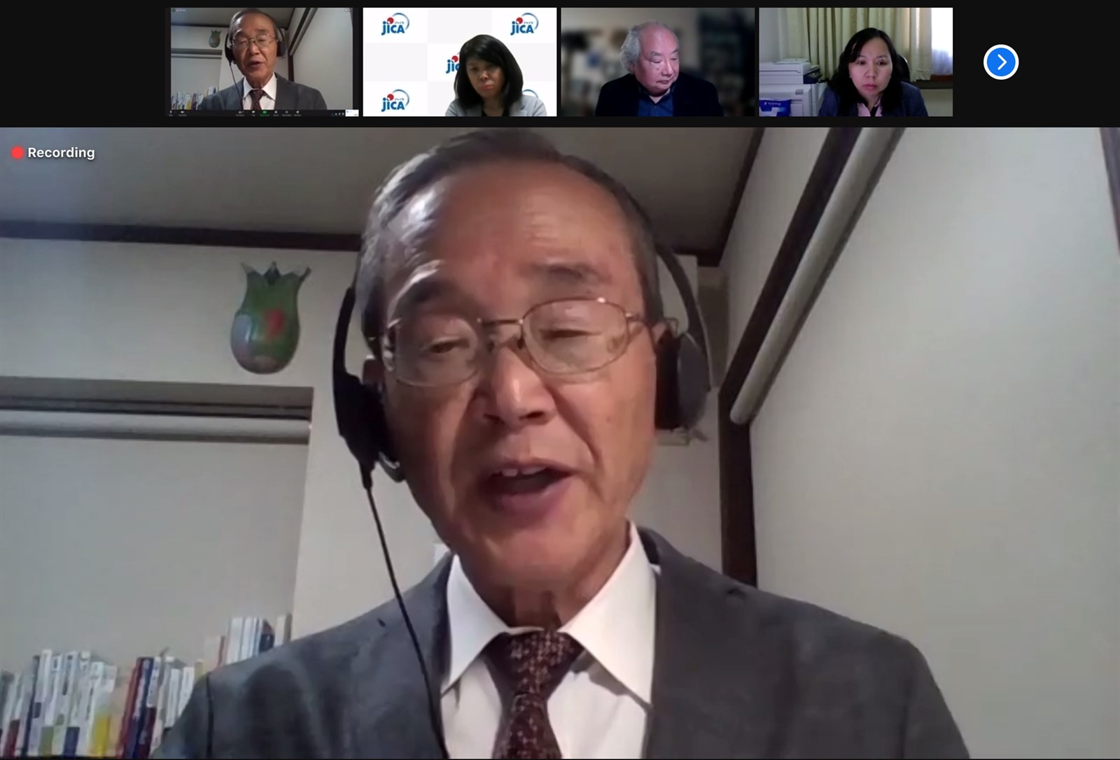 Дараа нь хэлэлцүүлэгт Япон Улсаас онлайнаар оролцсон илтгэгч нар илтгэлээ тавилаа. Япон Улсын Эдийн засаг, төлөвлөлтийн агентлагийн Нэгдсэн төлөвлөлтийн газрын дарга асан Үшижима Шүничиро Япон Улсын эдийн засгийн төлөвлөгөө, үндэсний хөгжлийн цогц хөтөлбөрийн туршлагын талаар илтгэл тависан. Тэрбээр илтгэлдээ дайны дараах Япон Улсын эдийн засгийн хөгжил, хөгжлийн үе шат, эдийн засгийн төлөвлөгөө, үндэсний хөгжлийн цогц хөтөлбөрийн түүх, эдийн засгийн төлөвлөлтийн механизмын талаар танилцуулж, тэр дундаа амжилттай хэрэгжсэн төлөвлөгөө болох 1955 оноос хэрэгжсэн “Иргэдийн орлогыг нэмэгдүүлэх” төлөвлөгөөг онцолж, танилцуулсан юм.