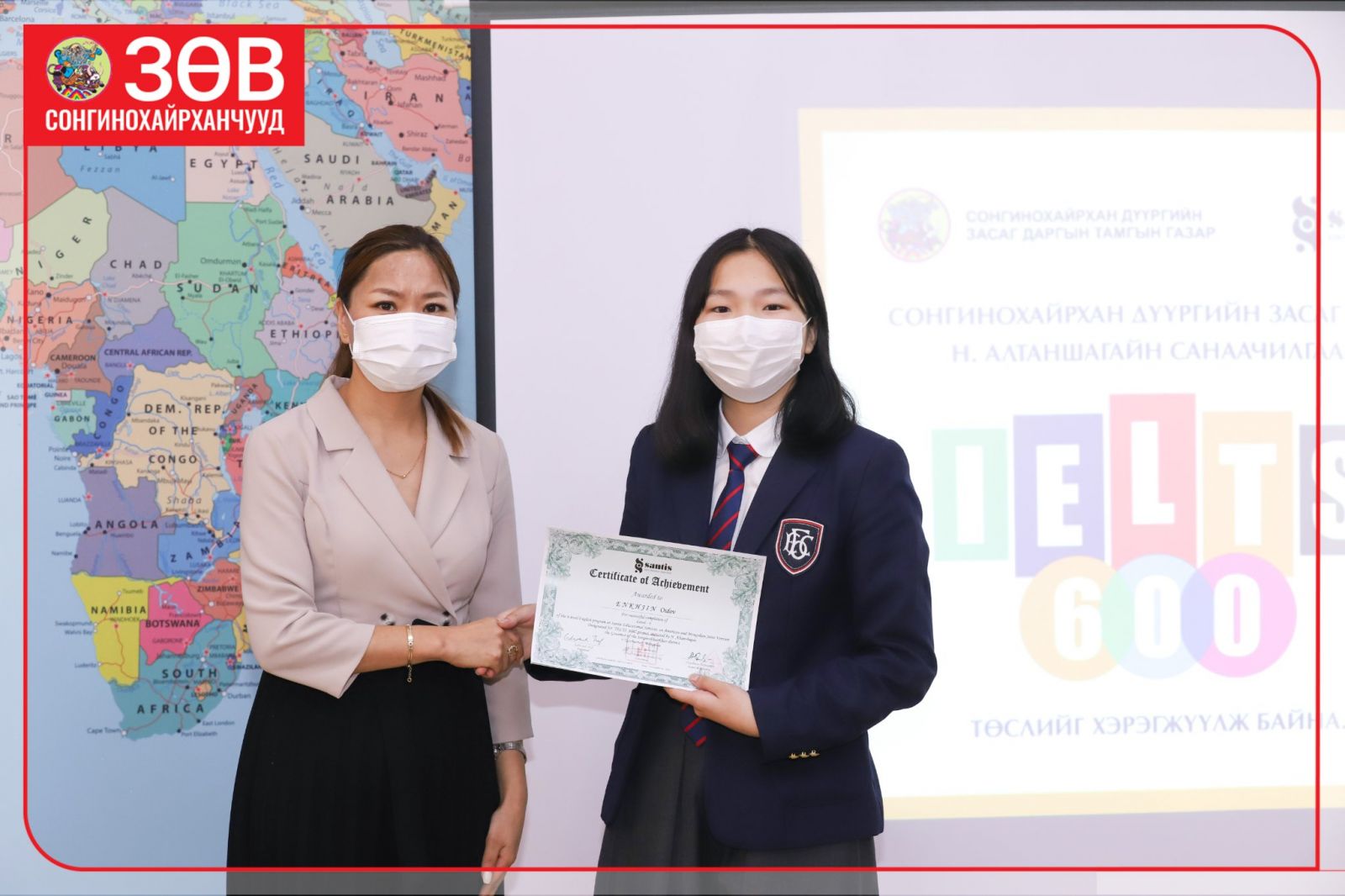 Өнгөрөгч зургадугаар сард Сонгинохайрхан дүүрэг “Сантис боловсролын төв”-тэй хамтран хэрэгжүүлсэн “IELTS-600” төсөл амжилттай хэрэгжиж зургаан сарын хугацаанд “Сантис боловсролын төв”-д англи хэлний гурав болон дөрөвдүгээр түвшний мэдлэг эзэмшсэн сурагчид олон улсын сертификатаа гардан авлаа.
