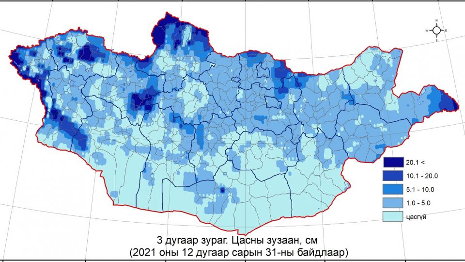 Цаг уурын байгууллагын ирүүлсэн мэдээллээр 12 дугаар сарын 31-ний байдлаар нийт нутгийн 50 гаруй хувьд цастай байна.