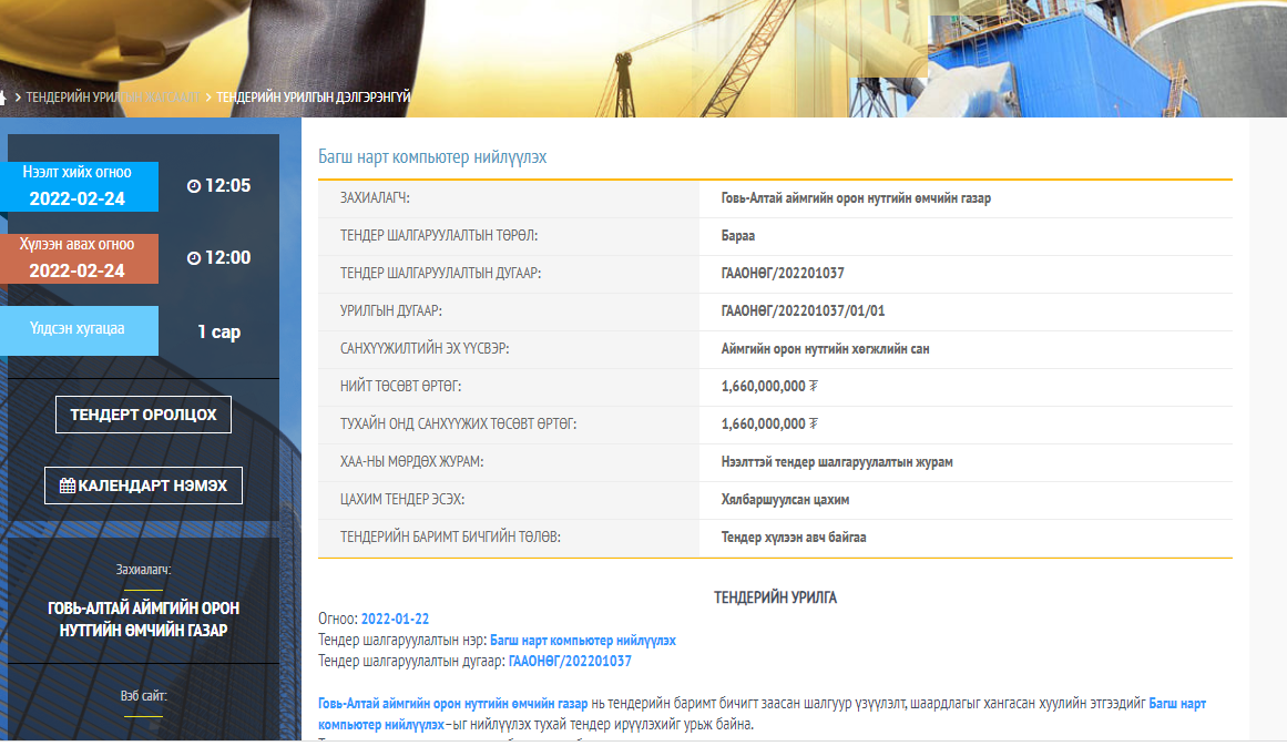Говь-Алтай аймгийн орон нутгийн өмчийн газрын захиалгаар багш нарт 1.666.000.000 төгрөгийн үнэтэй компьютерыг худалдаж авах тендер зарлажээ. Аймгийн орон нутгийн хөгжлийн сангаас санхүүжиж байгаа уг тендерийг 2022 оны 1-р сарын 22-ны өдөр зарлагдаж, 2022 оны 4-р сарын 2022 оны 02 -р сарын 24 -ны өдрийн 12 цаг 00 минутаас өмнө хүлээж авахаар тооцооолжээ.