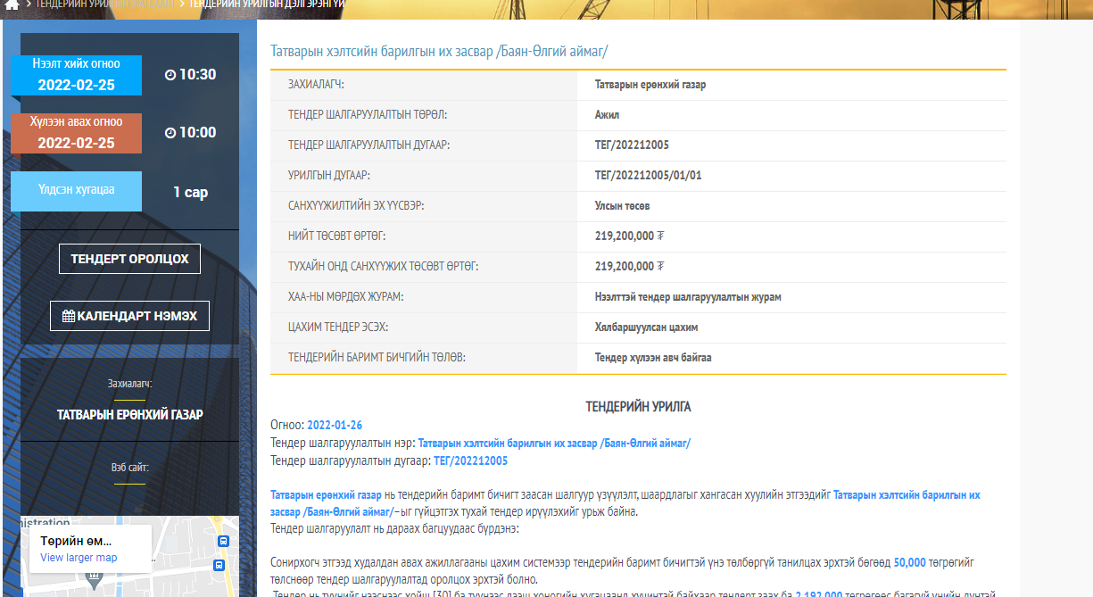 Жишээлбэл, 2022 оны 1-р сарын 16-ны өдөр Баян-Өлгий аймгийн татварын хэлтсийн барилгын их засварын тендер зарласан байна.