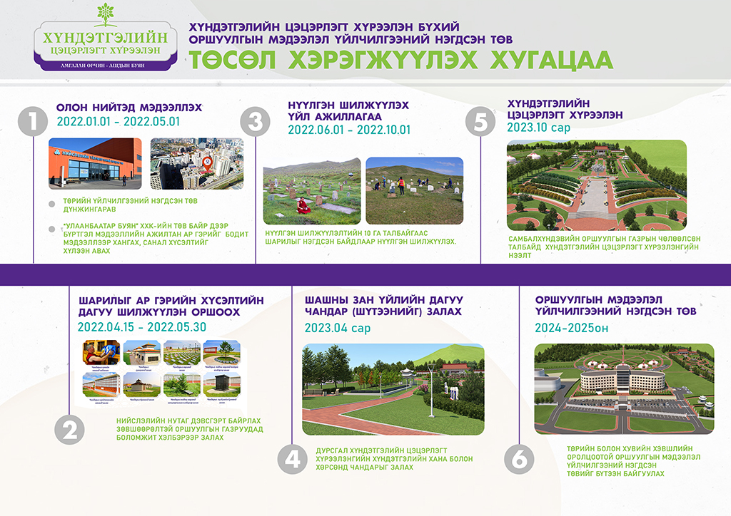 -Төслийн хүрээнд шарил нүүлгэн шилжүүлэх, чандарлах ажлыг 2022 оны дөрөвдүгээр сарын 15-наас эхлүүлэхээр төлөвлөсөн. Мэдээж шарилыг холбогдох хууль тогтоомж, стандарт, нийтээр хүлээн зөвшөөрсөн зан суртахуун, ёс заншилд нийцүүлэн, нэгдсэн журмаар хүндэтгэлтэйгээр газраас гарган чандарлаж, чандрыг шинээр байгуулах дурсгал, хүндэтгэлийн цэцэрлэгт хүрээлэнд зална.