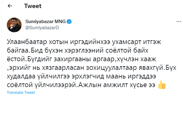 Сар бүрийн 1-ний өдөр согтууруулах ундаагаар үйлчлэх, худалдаалахыг хориглосон шийдвэрийг хүчингүй болгох захирамжийг Улаанбаатар хотын захирагч бөгөөд нийслэлийн Засаг дарга Д.Сумъяабазар гаргасан. Тус шийдвэртэй холбогдуулан иргэн, ААН-үүдэд хуулиа дагаж мөрдөн ажиллахыг сануулсан юм. Тэгвэл Улаанбаатар хотын захирагч бөгөөд нийслэлийн Засаг дарга Д.Сумъяабазар өөрийн цахим хуудаснаа "Улаанбаатар хотын иргэдийнхээ ухамсарт итгэж байгаа. Бид бүхэн хэрэглээний соёлтой байх ёстой. Бүгдийг захиргааны аргаар, хүчлэн хааж ,эрхийг нь хязгаарласан зохицуулалтаар явахгүй. Бүх худалдаа үйлчилгээ эрхлэгчид маань иргэддээ соёлтой үйлчилээрэй. Ажлын амжилт хүсье ээ" гэжээ.