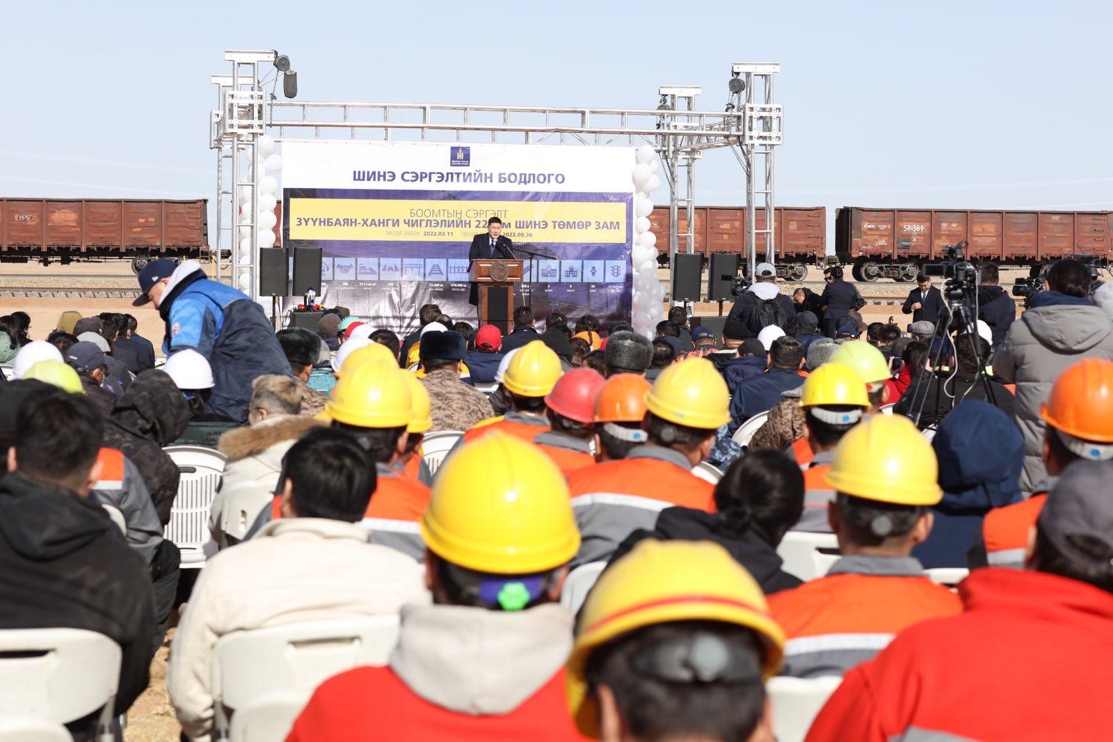 Харин өнөөдөр “Шинэ сэргэлтийн бодлого”-ын хүрээнд хэрэгжүүлж буй хоёрдахь том төсөл болох Зүүнбаян-Ханги чиглэлийн 226 километр төмөр замын бүтээн байгуулалтын ажлыг төр, хувийн хэвшлийн түншлэлээр эхлүүлж, хагас жилийн дотор ашиглалтад оруулах томоохон зорилтыг дэвшүүлж байна.