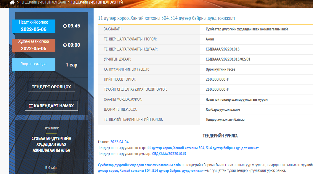 Өчигдөр буюу 2022 оны 04-р сарын 05-ны өдөр Сүхбаатар дүүргийн худалдан авах ажиллагааны алба СБД-ийн 11-р хороололд байралалтай Хангай хотхоны 504, 514 дүгээр байрны дунд тохижилтыг 250 сая төгрөгөөр хийж гүйцэтгэх компаниудын дунд тендер зарлажээ.