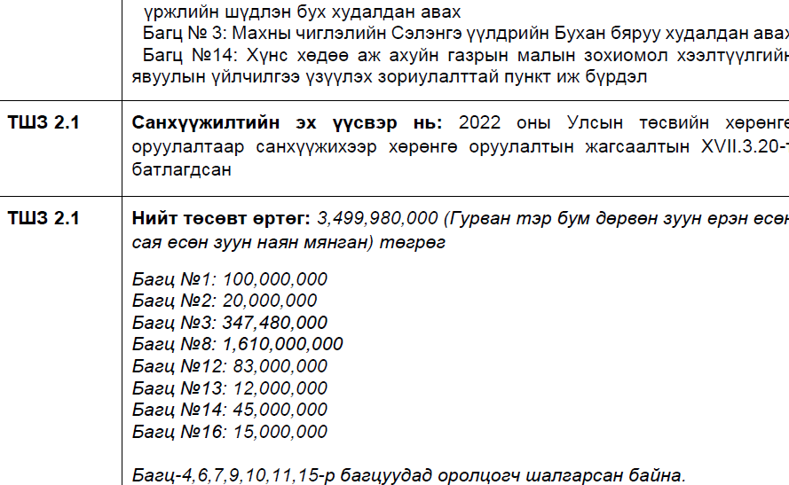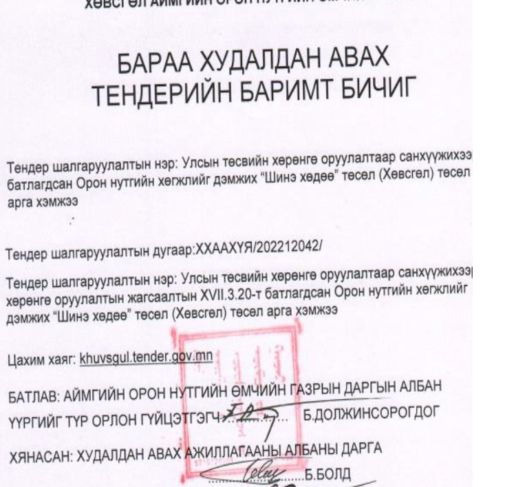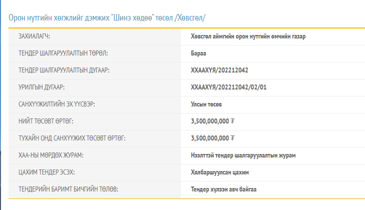 Тодруулбал, 2022 оны 4-р сарын 01-ний өдөр 3 тэрбум 500 сая төгрөгийн төсөвтэй “Шинэ хөдөө” төслийг Хөвсгөл аймагт гүйцэтгэх тендерийн сонгон шалгаруулалтыг зарлажээ. Уг тендерийг 2022 оны 05-р сарын 02-ны өдрийн 11 цаг 45 минутаас өмнө хүлээж авахаар тооцоолжээ.