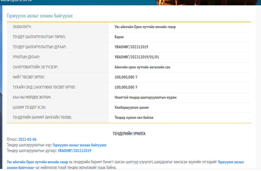 Увс аймгийн Орон нутгийн өмчийн газар 2022 оны 05-р сарын 06-ны өдөр "Гэржүүлэх ажлыг зохион байгуулах" тендер зарлажээ. Уг ажлыг орон нутгийн хөгжлийн сангаас 100 сая төгрөгөөр санхүүжүүлэх юм гэнэ. Тендерийн материалыг 2022 оны 06-р сарын 06-ны өдрийн 10 цаг 00 минутаас өмнө хүлээж авахаар тооцоолжээ.