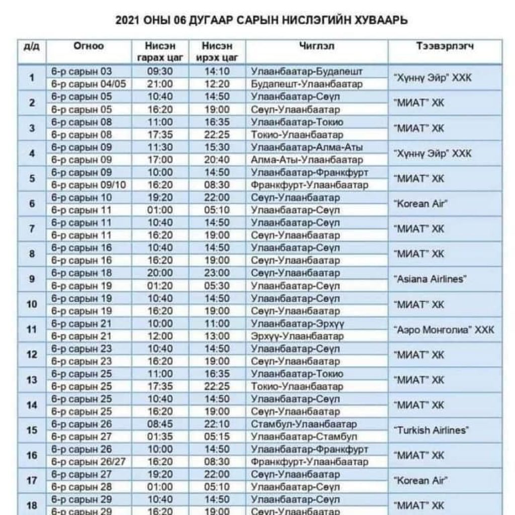 Иргэний нисэхийн Ерөнхий газраас /ИНЕГ/ зургадугаар сарын нислэгийн хуваарийг танилцууллаа. Ирэх сард нийт 20 удаагийн тусгай үүргийн нислэгийг Өмнөд Солонгос, Япон, Унгар, Турк, Герман, ОХУ, Казахстан улс руу хийж, иргэдээ татан авахаар төлөвлөсөн байна.