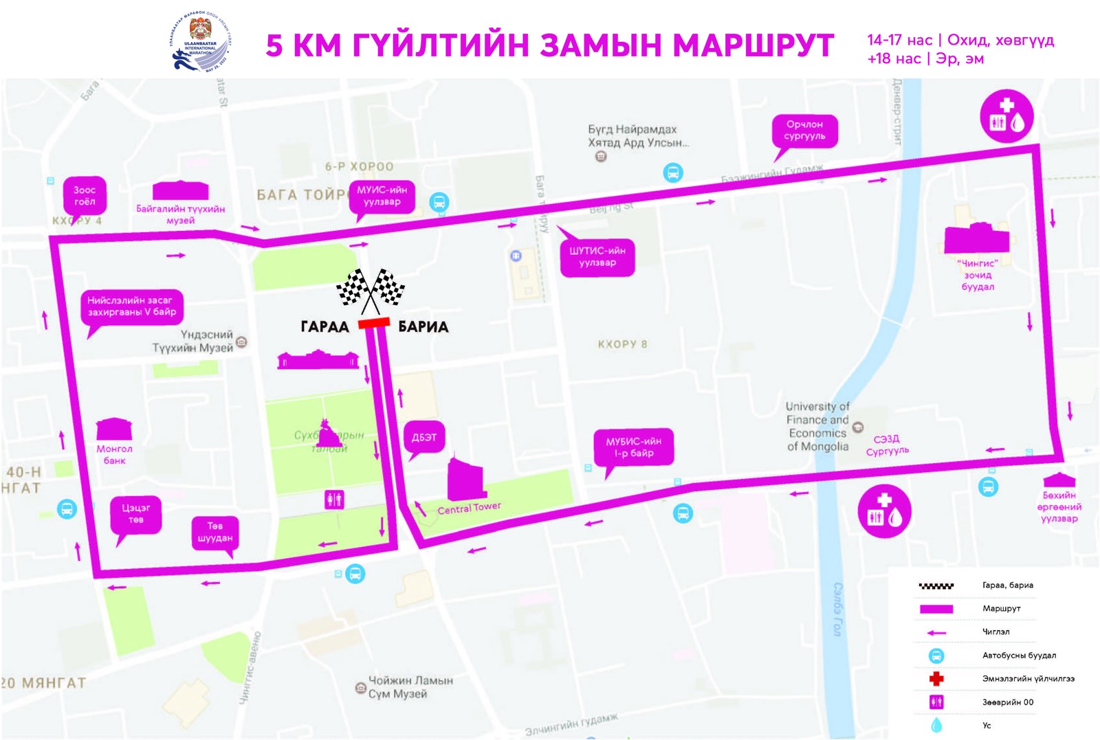 5000 м: /ГАРАА/ - Д.Сүхбаатарын талбай - Төв шуудан - Энхтайваны өргөн чөлөө - Цэцэг төв - Зоос гоёл - МУИС - Бээжингийн гудамж - Чингис зочид буудал - Бөхийн өргөө - Энхтайваны өргөн чөлөө - СЭЗИС - МУБИС - Дуурь бүжгийн эрдмийн театр – Д.Сүхбаатарын талбай /БАРИА/