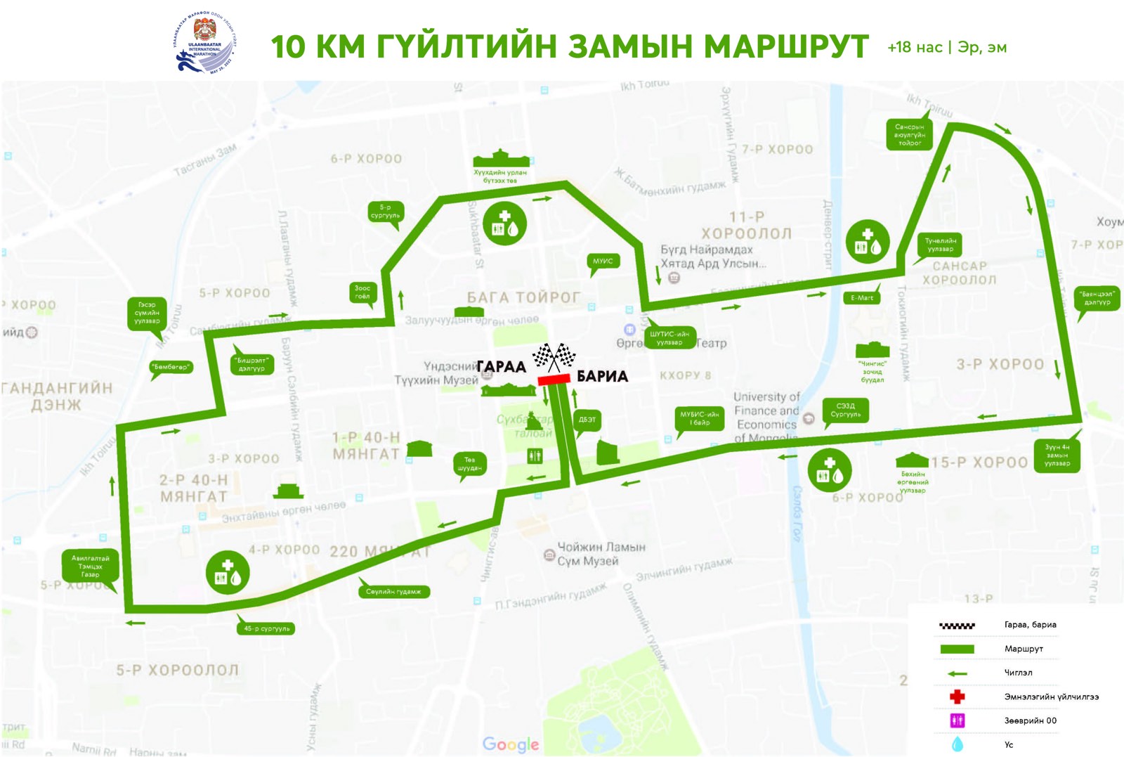 10.000 м: /ГАРАА/ - Д.Сүхбаатарын талбай-Төв шуудан - Сөүлийн гудамж - "Норе" шүдний эмнэлэг - Бишрэлт дэлгүүр - Зоос гоёл - V сургууль - Хүүхдийн урлан бүтээх төв - МУИС - ШУТИС-ийн уулзвар - Чингис Зочид буудал - Сансарын туннел /Сансарын туслах зам/ - Баянцээл дэлгүүр - Зүүн 4-н замын уулзвар - Бөхийн өргөө - СЭЗДС - МУБИС - Элчингийн гудамж - ДБЭТ – Д.Сүхбаатарын талбай /БАРИА/