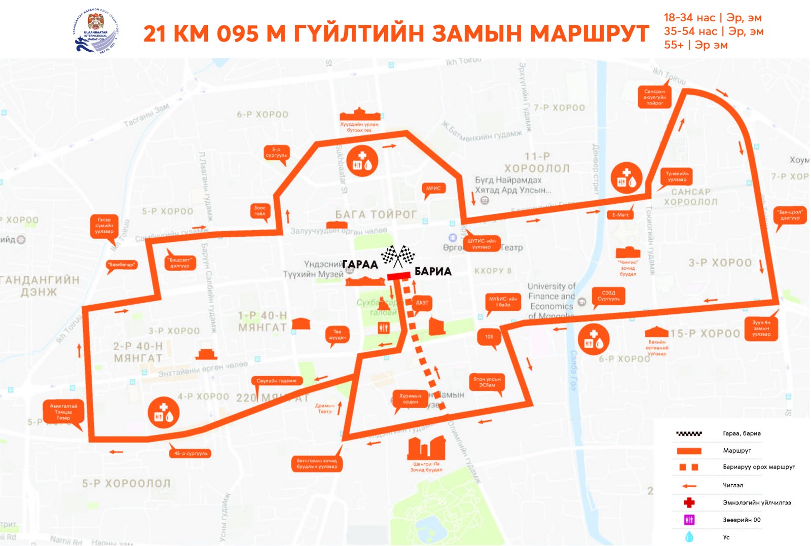 Хагас марафон: /ГАРАА/ - Д.Сүхбаатарын талбай-Төв шуудан - Сөүлийн гудамж - "Норе" шүдний эмнэлэг - Бишрэлт дэлгүүр - Зоос гоёл - V сургууль - Хүүхдийн урлан бүтээх төв - МУИС - ШУТИС-ийн уулзвар - Чингис Зочид буудал - Сансарын туннел /Сансарын туслах зам/ - Баянцээл дэлгүүр - Зүүн 4-н замын уулзвар - Бөхийн өргөө - СЭЗДС - МУБИС – 103 - Элчингийн гудамж – Япон улсын ЭСЯ – Шангрила зочид буудал – Баянгол зочид буудлын уулзвал – Драмын театр – Сөүлийн гудамж – /10 км-ийн замыг 2 тойроод барианд орохдоо/ - МУБИС – 103 - Элчингийн гудамж - ДБЭТ – Д.Сүхбаатарын талбай /БАРИА/
