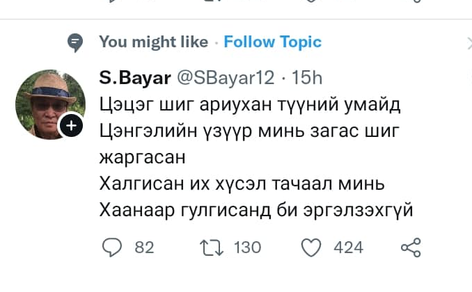 Монгол улсын ерөнхий сайд асан С.Баяр нь улс төрөөс хөндийрч залуу үеийнхэндээ зайгаа тавьсан гэж хэлэхэд хилсдэхгүй биз ээ. Тэрбээр сошиал орчинд буюу тэр дундаа твиттер хуудаснаа олны анхаарлыг татсан нийтлэл, мэдээллүүдийг нийтэлдгээрээ аль хэдийнээ алдартай болсон. Тэгвэл түүний ээлжит сенсаци олны анхаарлыг татаад авлаа. Тэрээр твиттер хуудаснаа