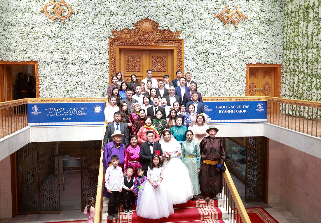 -2022 он гарснаас хойш өнөөдрийг хүртэлх хугацаанд 140 хос Гэрлэх ёслолын ордонд гэрлэлтээ батлуулан, хуримаа хийгээд байна. Нийслэлийн Гэр бүл, хүүхэд, залуучуудын хөгжлийн газрын санаачилгаар нийслэлийн харьяа байгууллагуудад ажилладаг 60 хосын хуримын ёслолыг хийсэн. Өнөөдөр УСУГ-ын ажил хөдөлмөрөөрөө шалгарсан зургаан хосын гэрлэх ёслолыг хийж, амьдралынх нь нандин дурсамжийг бүтээлээ. Ажилтан ажиллагсдынхаа амьдралд тохиолдох алтан агшныг мөнхлөн үлдээж буй байгууллага, хамт олонд талархсанаа илэрхийлье.