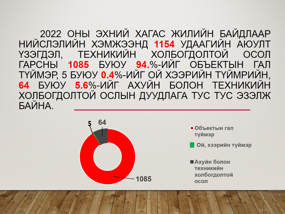 Нийслэлийн хэмжээнд 2022 оны эхний хагас жилийн байдлаар аюулт үзэгдэл, техникийн холбогдолтой ослын нийт 1154 удаагийн дуудлага мэдээлэл ирж, алба хаагчид шуурхай үүрэг гүйцэтгэж ажилласан байна.
