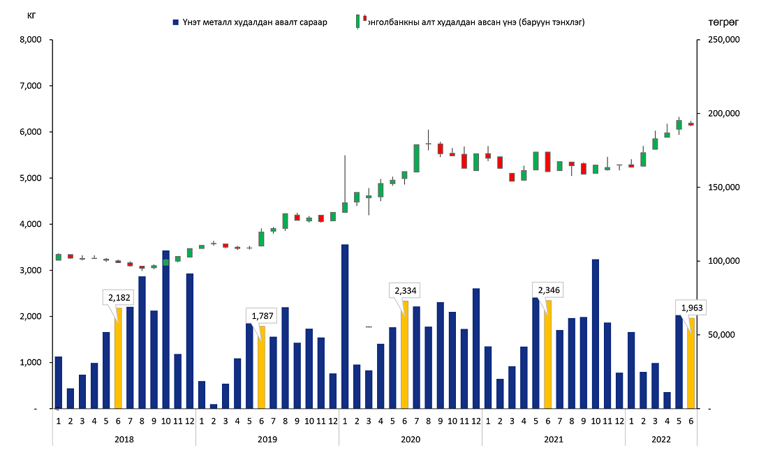 Монголбанкны үнэт металл худалдан авах үнийг дэлхийн зах зээл дээрх үнээр тогтоодог. 2022 оны 6 дугаар сард дундаж үнэ 193,390.83 төгрөг байв (Зураг 2).